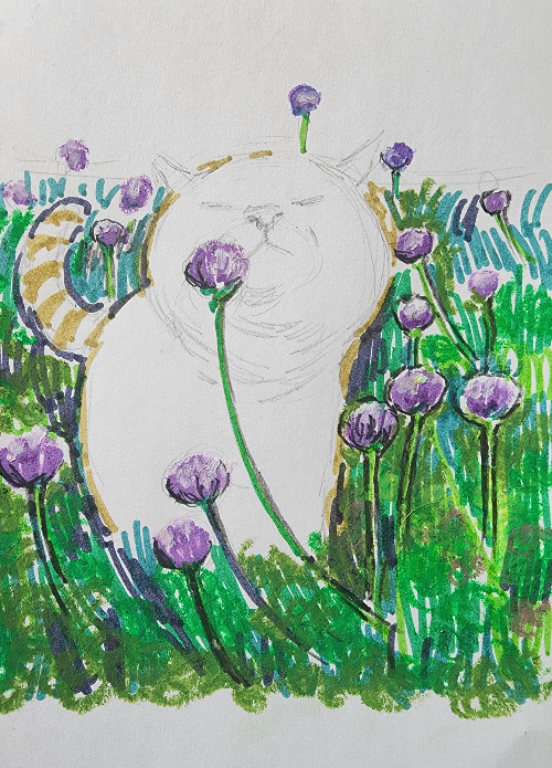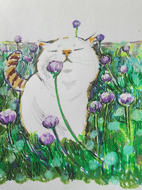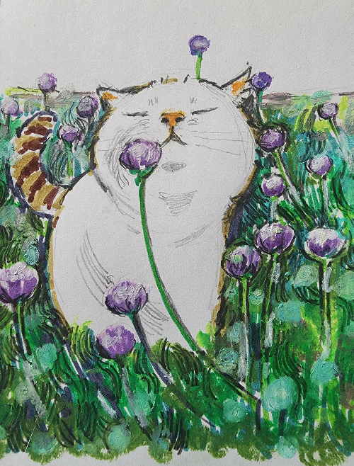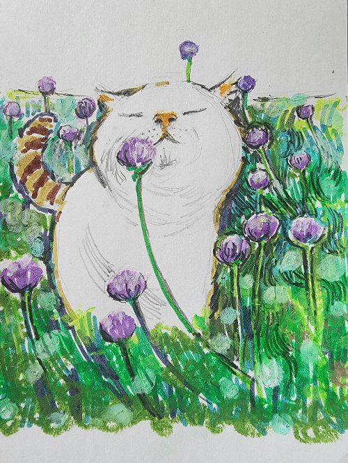 이 그림을 그리고 나서 일본영화 '네코렌털~"이 생각났어. 무지 외로운 남자가 구멍 난 양말을 보여주며 "나는 냄새가 많이 나요.", "괜찮아요 우리 고양이는 꼬랑꼬랑한 냄새를 좋아해요~^^. " 맞아맞아~우리 집 고양이도 냄새 맡는 것을 아주 좋아해. 내가 꽃다발 하나 가져오면 작은코를 벌름거리며 꽃다발 안에 들이밀고 꼼꼼하게 냄새를 맡다가 꽃다발 위에서 뒤집어져서 버둥거려~ 너무 좋아서 말이야~ 고양이가 냄새 맡기를 좋아하는 이유가 있겠지?