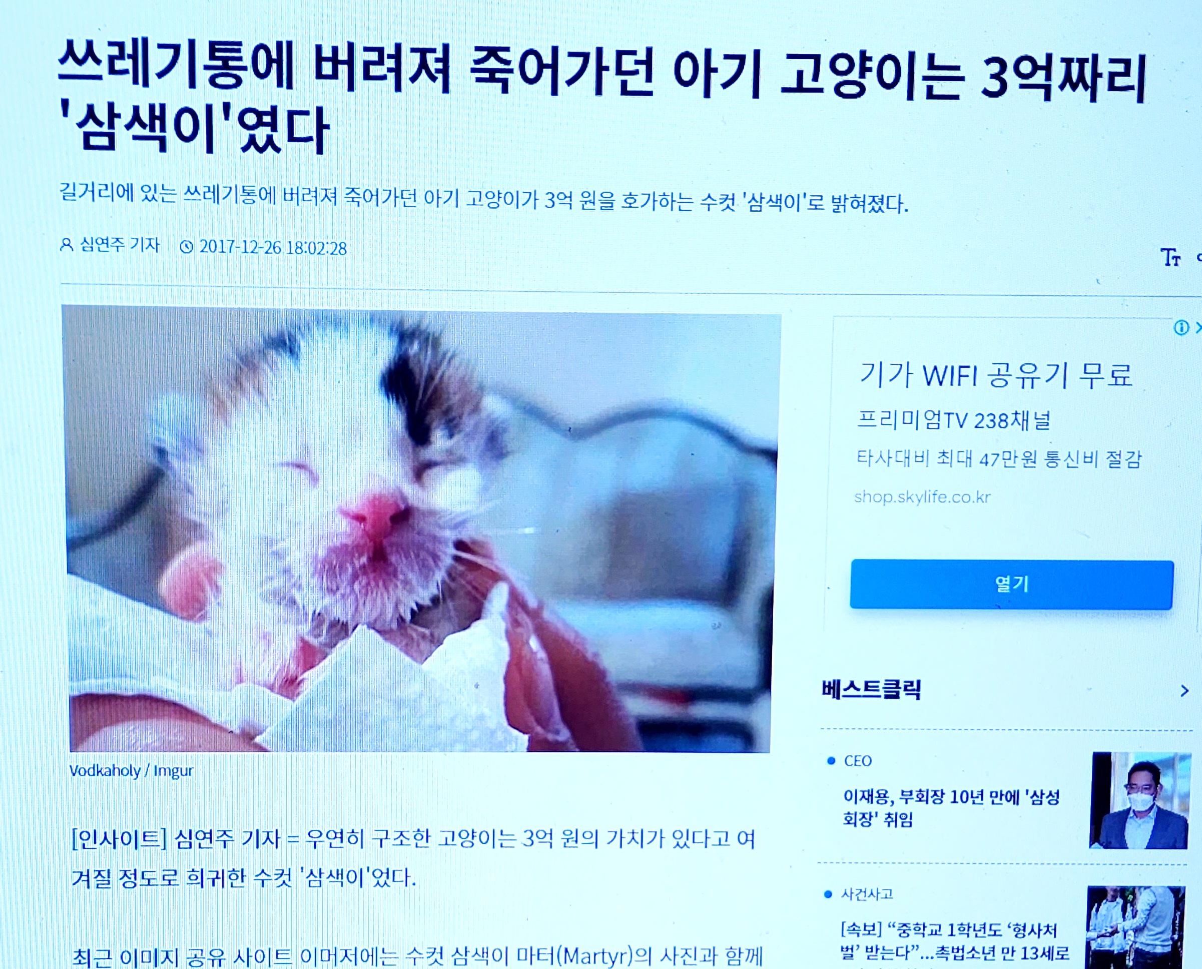 삼색이는 얼룩무늬 고양이로 세 가지 털색을 가진 거야. 흰색, 검정, 진노랑으로 색종이 오려 붙인 것처럼 경계가 뚜렷하게 보여. 이와 비슷하지만 여러 가지 색이 혼돈되어 있는 경우에는 카오스라고 하더라~ 근데 말이야... 삼색이는 약간 뻥쳐서 99.9999%가 암놈이래. 흰색 말고 검정과 노랑의 고양이 털색 유전자가 X염색체에서 발현되어서 XX인 암컷에만 어쩌고 저쩌고~ 그래서 수컷은 거의 없거나 있어도 번식능력이 없대. 혹, 길가다 삼색이 보면 진짜 진짜 잘 살펴봐~ 왜냐면, 삼색이가 수컷일 경우 3억!!!! 원 이래잖아