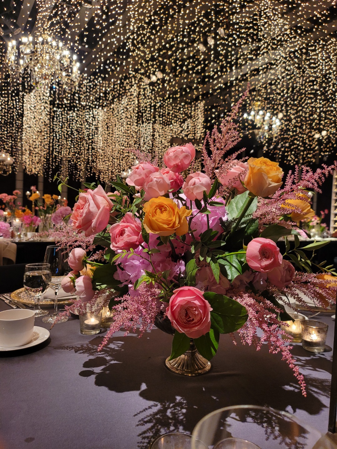 연회장 입구에서 내 이름을 보고 몇 번 테이블인가를 확인하고 안으로 들어갔어~ 세상에나!!!!!! 검은색 실내 안, 천정에서는 반짝이는 은하수를 방안 가득히 흘려서 내려보내고~ 내 눈따라 아름답고 우아한 꽃색이 가로로 넓게 펼쳐져 있었어~ 그리고 커다란 둥근 테이블 위에는 황금빛 고급스러운 플레이트와 꽃과 와인잔으로 세팅을 쫘악해놓았더라~ 사진 봐 봐~ 엄청 화려하지? 결혼식은 사회자 진행으로 순서에 따라 신랑 신부 엄마 입장~ 신부 입장~ 신랑 입장!!! 주례는 윤진식 전 장관님이 해주셨어~ 진짜, 평생 한 번뿐!! 이라야 맞을 결혼식 답더라~ 황금빛 접시는 그냥 갖고 가고.. 흰 접시 위에 블랙 앵거스 안심 구이를 줬거든~ 손바닥만 한 고기가 두껍고 까만데... 칼로 자르니깐 안에는 핏빛이 돌았어.. 그런데 씹는 식감도 좋았고, 부드럽고 고소한 것이 목안으로 살살 잘 넘어가더라고~ 맛??? 좋았어!!! 하나도 남김없이 다 먹었지(뭐라고? 그래서 살이 찐다고? 냐옹아 네가 할 말은 아니잖아... 네 몸매를~ ) 그리고 참!!! 소주 한 병 4만 원! 이랬어~ 와아~