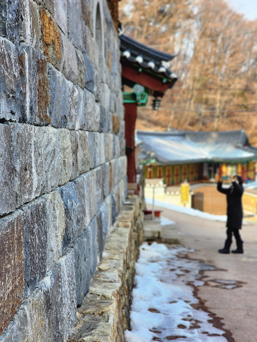 퇴물림이라고 하면 성벽을 쌓을 때, 아래에는 무겁고 긴 돌을 쌓고 위로 올라갈수록 작고 가벼운 돌을 조금씩 뒤로 물려 가며 쌓는 방법이 퇴물림이라잖아. 우리나라에서 석축을 쌓는 전통적인 방법으로 절의 축대를 퇴물림으로 쌓는다고 해서... 진짜 석축이 뒤로 밀렸나 사진을 찍어봤어. 근데 맞네 맞아~ 대문하고 비교하면 위로 올라갈수록 뒤로 밀린 것 맞지? 우연히 얻어들은 거지만 내눈으로 확인하게 되면 왜 이렇게 반가운지~ 정말 반가워!!!