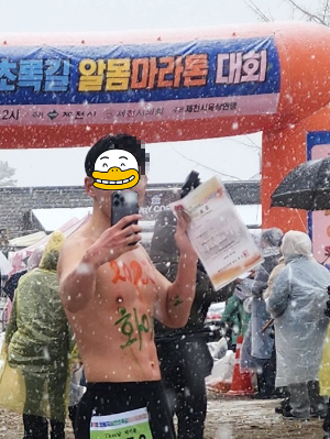 거의 다 들어왔는지 모두 흩어져서 사진 찍고, 어수선한 가운데 1등 2등 3등... 시상하고, 인기상에 포토제닉상도 주고, 이런저런 상들을 마구마구 주더라고. 구경하던 나는 얼떨결에 남 사진도 찍어주고, 동영상도 찍어주고... 의림지 알몸마라톤대회에서 내가 왜 바빠야 했는지 몰라~ 6043님도 만나 격하게 반가워했고... 그리고 나오는 길에, 마지막에 걸어 들어오는 마라토너를 보았어. 시간을 보니 11시 5분, 7km를 1시간 5분에 완주한 것이지. 그래그래 잘했어 잘했어. 눈 내리는데 중간에 집에 안 가고 말이야... 그대, 2023년 새해에는 뭐든지 잘할 수 있을 거야!!! 그대를 응원해!!!