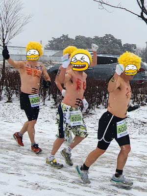 1등이 24분 35 초래... 7km니깐 1km를 3분 39초에 달린 것이지... 보통 걷기를 하면 1km 10분쯤 걸리나? 골인지점은 완전 축제야. 다음에 또 마라톤대회구경을 한다면 안 돌아다니고 요기만 있을 거야~ 출발하는 모습하고 결승점 통과가 젤 재밌는 것 같아. 에너지가 넘치고, 참가자 구경자 모두가 즐겁고 웃음이 넘쳤어. 눈 오는 날의 알몸 마라톤축제는 성공이야!!!