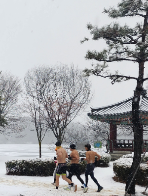 에코브릿지아래에 차를 대고 눈 속을 빠르게 걸었어. 난 요즘 뛰는 것을 잘 못해ㅠㅠ. 사람들이 우르르 달려 내려오는데, 다들 웃는 모습이야. 눈 맞고... 비 맞고 달리기 하는 것은 애들만 좋아라~ 하는 줄 알았지 뭐야. 눈 속을 달리던 사람들이 카메라를 들고 있는 나를 보고 웃어주었어. 전국각지에서 모인 유쾌한 사람들이라 매너하나는 끝내줘~ 이 사진 귀한 사진일 텐데... (오늘 알몸님들이 보면 좋겠다고 올렸는데 혹, 원본 필요하시다면 댓글 주셔요~ ^^) 여기서도 사람들이 빠르게 사라지고 있는 거야.. 어떻게 뛰는 사람이 차 타고 따라다니는 나보다 빠른지 몰라.