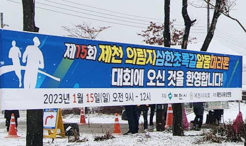 현수막은 한 두 달 전부터 시내곳곳에 걸려있었어. 접수기간은 22. 12.10.~23.1.10. 까지였고, 대회는 23.1.15.(일), 출발은 10:00, 대회장소는 제천의림지, 코스는 7km, 참가비 20,000원, 복장은 알몸??? 이 아니고 하의반바지, 롱타이즈, 장갑, 모자... 여성은 상의반팔 T셔츠, 참가자격은 신체건강한 남, 여... 그리고 기념품은 기록증, 완주메달, 경품증정, 제한시간은 1 시간 30분.. 공식홈페이지에 올라왔던 글이야. 6043님이 진작에 참가신청서 냈다고 했어. 공지사항은 꼼꼼히 읽어봐야 해. 술렁술렁 읽었다가는 낭패하기 십상이지~