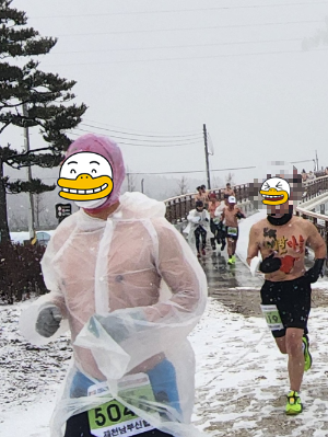 나 오늘 진짜 바빴어. 도대체, 차를 타고 달리는 나보다 왜 더 빠른 거야? 나는 힘들게 주차하고~ 마라톤코스를 따라서 눈바람 속에 오리털잠바를 적셔가며 거의 뛰다시피 다녔어. 달리기한번 안 해본 나지만 오늘의 나를 보니 내년엔 마라톤에 참가해도 될 것 같아. 반환점을 도는 사람들... 아까 의림지에서 만났고, 에코브릿지에서도 만났던 사람이야. 진짜 나도 같이 뛴 것 같아... 그랬겠지?