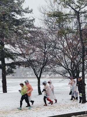 6043님을 응원하러 갔는데... 사람이 우르르 뛰어나오니.... 거기다 알몸이니 당근 찾을 수가 없지~ 눈 내리는 의림지 주변을 달리는 모습은 보는 나도 그렇지만 달리는 마라토너들도 즐거운 표정이었어... 눈이 펑펑 쏟아지는 이런 날은 병만 안 난다면 오랜 추억으로 길이길이 남을 멋진 날이지. 7km를 달리는 동안에 우리 학우인 컴맹님을 찾으려나? 몇 명이 참가했는지 끝이 없이 달려 나오는 모습에 멍해 있는데.... 금방 사람이 줄어드는 거야.. 그래서 차를 돌려 중간지점으로 가서 기다리기로 했어.