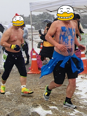 1등이 24분 35 초래... 7km니깐 1km를 3분 39초에 달린 것이지... 보통 걷기를 하면 1km 10분쯤 걸리나? 골인지점은 완전 축제야. 다음에 또 마라톤대회구경을 한다면 안 돌아다니고 요기만 있을 거야~ 출발하는 모습하고 결승점 통과가 젤 재밌는 것 같아. 에너지가 넘치고, 참가자 구경자 모두가 즐겁고 웃음이 넘쳤어. 눈 오는 날의 알몸 마라톤축제는 성공이야!!!