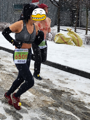 나 오늘 진짜 바빴어. 도대체, 차를 타고 달리는 나보다 왜 더 빠른 거야? 나는 힘들게 주차하고~ 마라톤코스를 따라서 눈바람 속에 오리털잠바를 적셔가며 거의 뛰다시피 다녔어. 달리기한번 안 해본 나지만 오늘의 나를 보니 내년엔 마라톤에 참가해도 될 것 같아. 반환점을 도는 사람들... 아까 의림지에서 만났고, 에코브릿지에서도 만났던 사람이야. 진짜 나도 같이 뛴 것 같아... 그랬겠지?