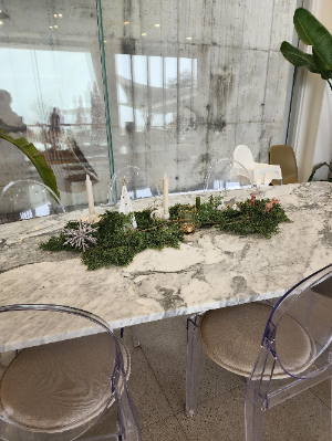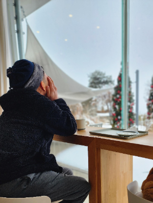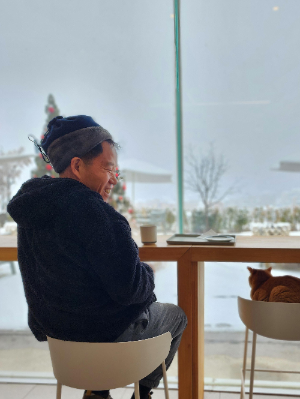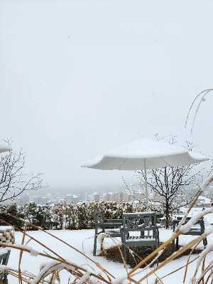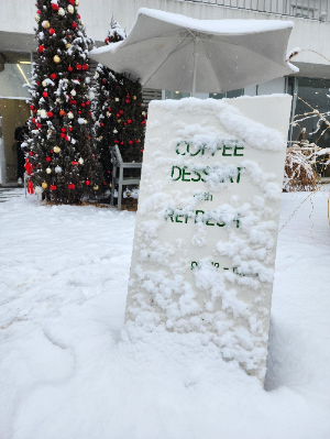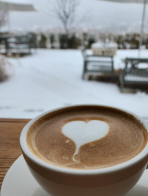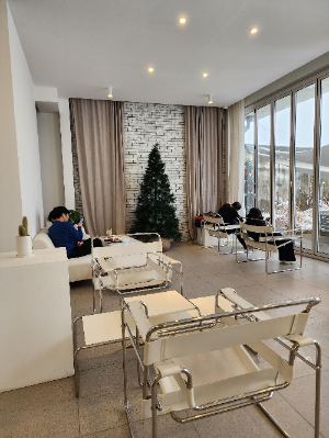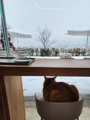 창가에 앉아 따뜻한 커피라테를 한잔 시키고, 크레파스고양이들에게 자세히 설명하려 여기저기를 살폈어. 전체가 화이트톤이야. 테이블도 하얀색, 의자도 하얀색.. 카페분위기가 결혼식장 같이 좀 품위 있고, 아름답고... 눈도 오고말이야. 언덕 위에 있어서인지 청량감을 주었어. 마스크 벗고 시원한 공기를 흠뻑 마시는 기분~ 아 시원해!!!
