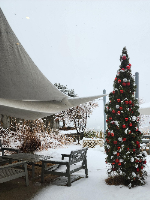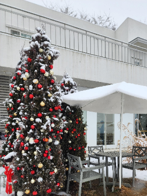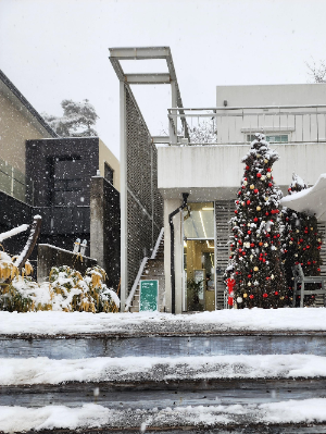 엄마차... 스노우타이어 안 바꿨잖아. 비탈길이라 올라갈 때 차가 밀려서 무서웠어. 주차하고 계단을 올라가니 안내판에는 눈이 쌓여 뭔 소린지도 모르겠고~ 뒤돌아보니 동네 아주 멀리까지 시야가 확~~ 아이고 시원해라~ 했어. 여긴 아주 깨끗한 크리스마스 같은 분위기야. 초록나무에 수없이 매달린 동그란 반짝이구슬 때문 일 거야. 여긴 1월의 크리스마스야!!!