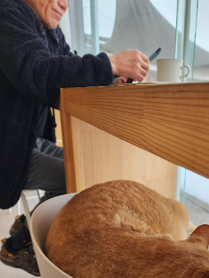 치즈태비 2마리가 한 형제인 듯 덩치랑 생긴 것도 똑같았어. 요기서 봤는데 저기서 나타나고... 손님옆에서 지루한 듯 이야기 들어주던 고양이를 보았는데, 나오면서 보니깐 또 한 마리가 카운터에 앉아서 오가는 사람을 체크하고 있었던 것이야. 한 마리는 손님을 미학적으로 관리를 하고, 한 마리는 손님을 현실적 관리를 하고 있는 중이야. 인간이 고양이를 유미주의 관점과 실용주의적인 관점에서 바라보듯 우리 도화리 작은 사장님들도 시선을 나눠서 따로 관리하고 있더라고~ 훌륭해!!!