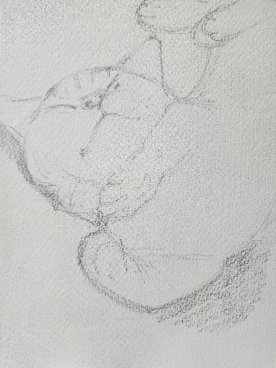 - 흰 종이에 4B 연필로 스케치, 얼굴이 기울어져있어서 이마, 귀, 눈, 코, 입, 턱선의 기울기가 같아지도록 유의한다.