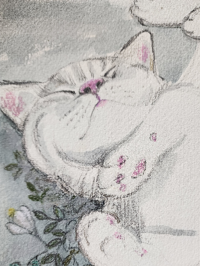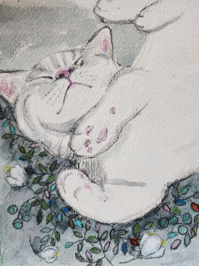 고양이가 허브향을 맞으며 좋아라 뒤집어지는 모습을 그렸어. 우리 크레파스고양이들은 이런 모습을 자주 보여줘. 큰 얼굴을 뒤로 젖히고, 짧은 팔은 가슴에 올려놓고, 허리는 활처럼 뒤로 동그랗게 젖혀놓고~ 오만가지 표정을 지으며 행복해하지. 핑크색 작디작은 코가 씰룩씰룩 부지런히 냄새를 맡으며 뒹굴뒹굴 뒹구는 모습은 보는 사람을 행복하게 해 주지~ 오늘 크레파스고양이 그림이 그대를 잠시나마 행복하게 해 주었으면 좋겠다~ 정말 좋겠다~