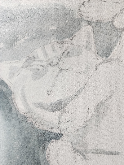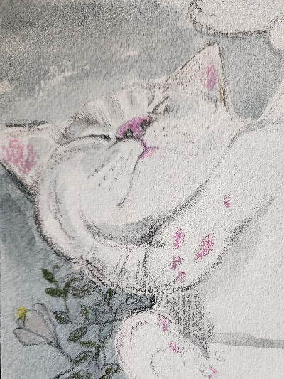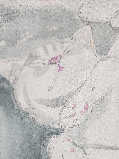- 흰고양이와 바탕색이 회색이므로 고양이는 적게 칠하고 바탕면을 강하게 표현하기로 함. 수채물감 흰색+검정+군청을 더해 청회색의 물감을 바탕면에 넓게 칠해준다.