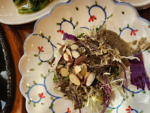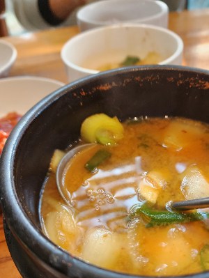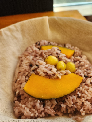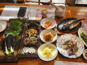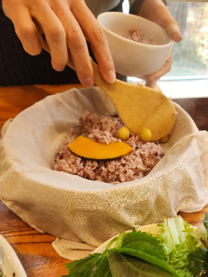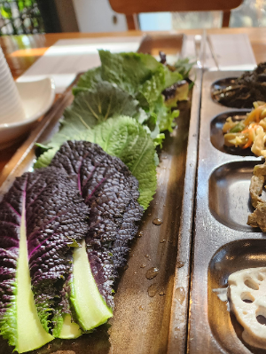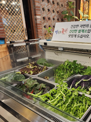 넓디넓은 식당 안, 창가 쪽 분위기 좋은 곳에 앉아서 옆좌석의 손님을 힐끔 보니깐 고등어와 수육!!! "우리도 저걸로 주세요~" 언니들 하여간에 소심하다 소심해~ 쌈밥이니까 야채가 싱싱해야겠지? 쌈밥 맛집 백운愛꽃에서는 신선실에 보관된 야채를 맘껏 가져다 먹을 수 있도록 해놓았어. 그런데 상차림이 너무 풍족해서 더 가져다 먹을 일이 없더라고. 유니품을 입은 단정한 종업원이 깨끗한 상차림을 만들어 주었어.. 밥은 베보자기에 찐 붉은 밥 위에 단호박 한 조각과 은행 두 알이 올려져 있었어. 그릇에 담아서 식사를 시작했지~ 샐러드 한 젓가락, 된장국 한 숟가락을 천천히 맛을 보며 "음~ 맛은 괜찮은데~" 깔끔하고 기분 좋은 상차림인 것을 확인하고 그다음부터는 우다다다다 먹는 거지 뭐~ 반찬이 간도 세지 않고 심심해서 야채 쌈 해서 양념된장을 올려서 먹었어. 음식의 양? 넉넉했어!!
