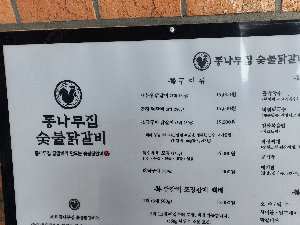4) 숯불 닭갈비집 메뉴: 고추장 닭갈비 (280g), 소금구이 닭갈비(280g) , 간장닭갈비(280g) 각 15,000원. 더덕구이(150g) 14,000원, 물막국수 8,000원, 비빔막국수 9,000원, 철판볶음밥 6,000원, 막장찌게 3,000원, 공깃밥 1,000원